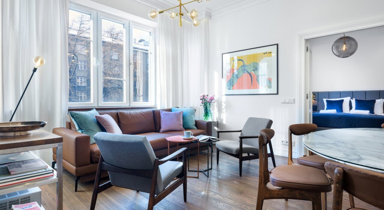 Wyjątkowy charakter wnętrz nadają stylowe meble i akcesoria. Część przestrzeni naszych apartamentów wypełniają produkty w stylu mid-century modern, łączące w sobie elegancję, prostotę i funkcjonalność.